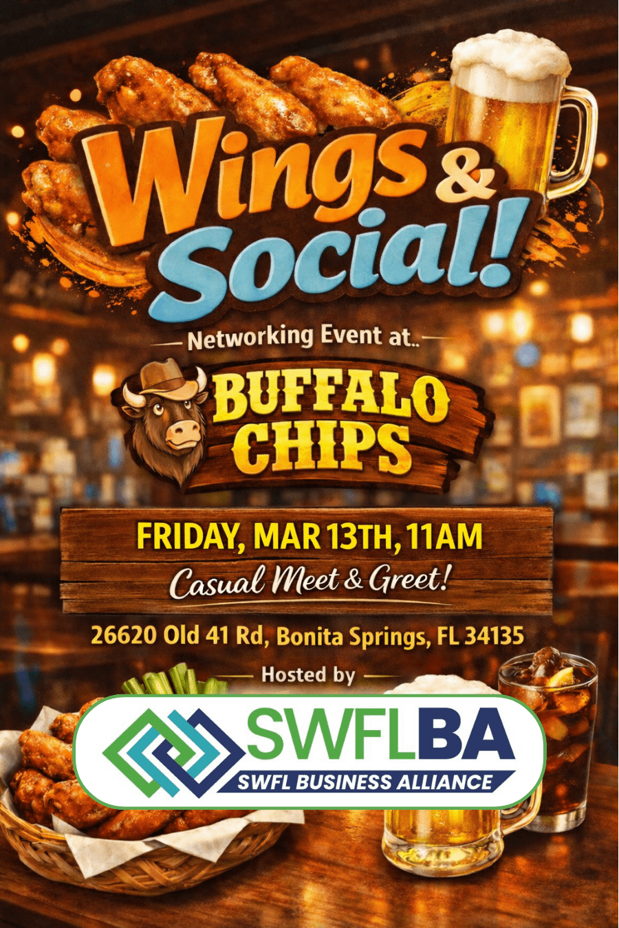 Join us for a casual meet and greet packed with great wings, cold drinks, and real local connections. This is relaxed networking done right.