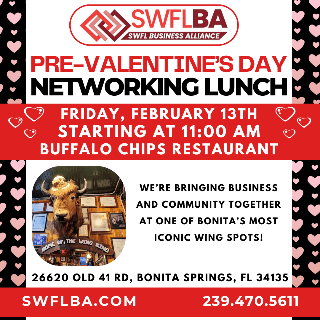 Friday the 13th at 11:00 AM for a laid-back, come-as-you-are networking lunch at Buffalo Chips Restaurant (26620 Old 41 Rd, Bonita Springs, FL 34135).